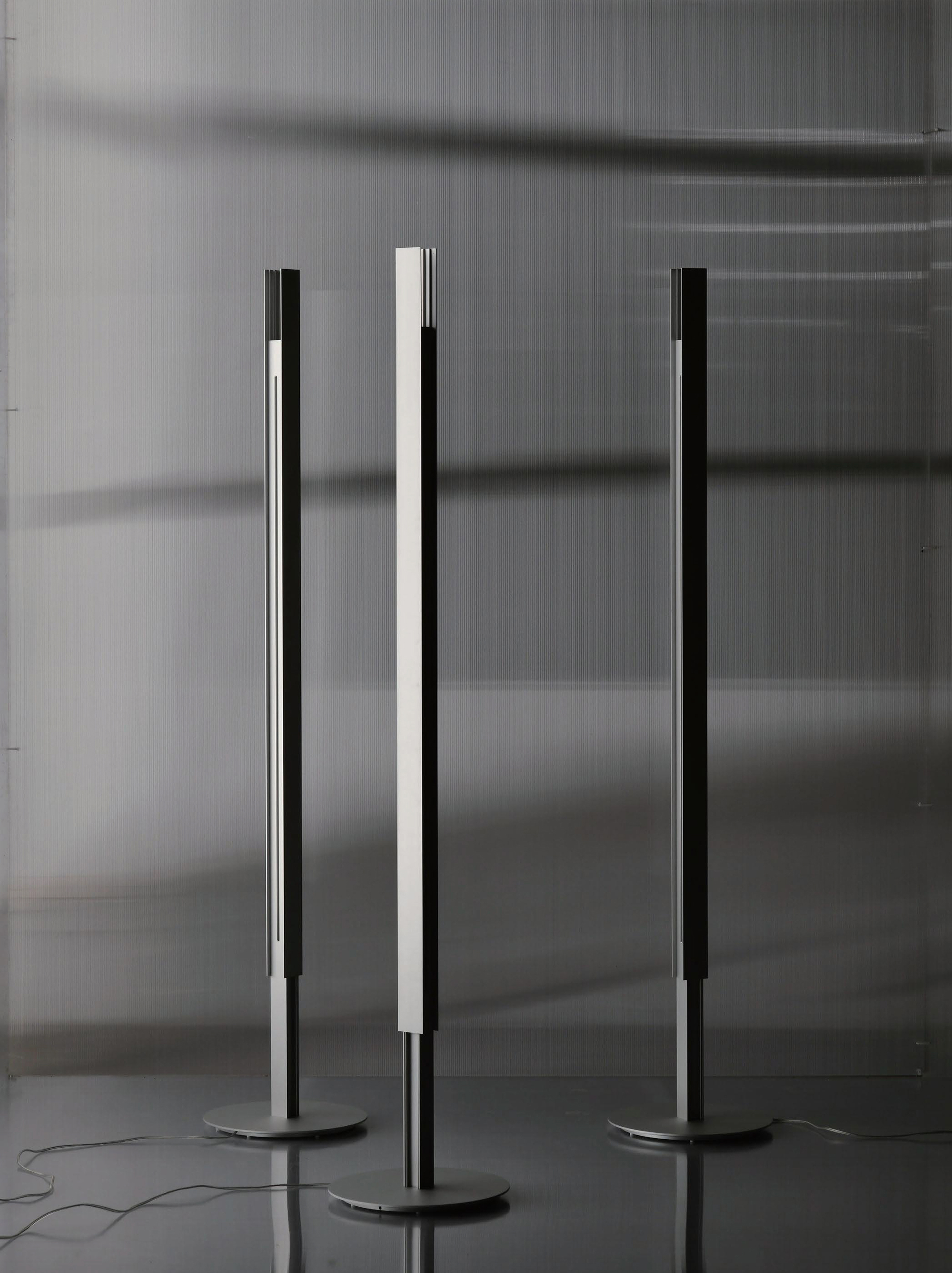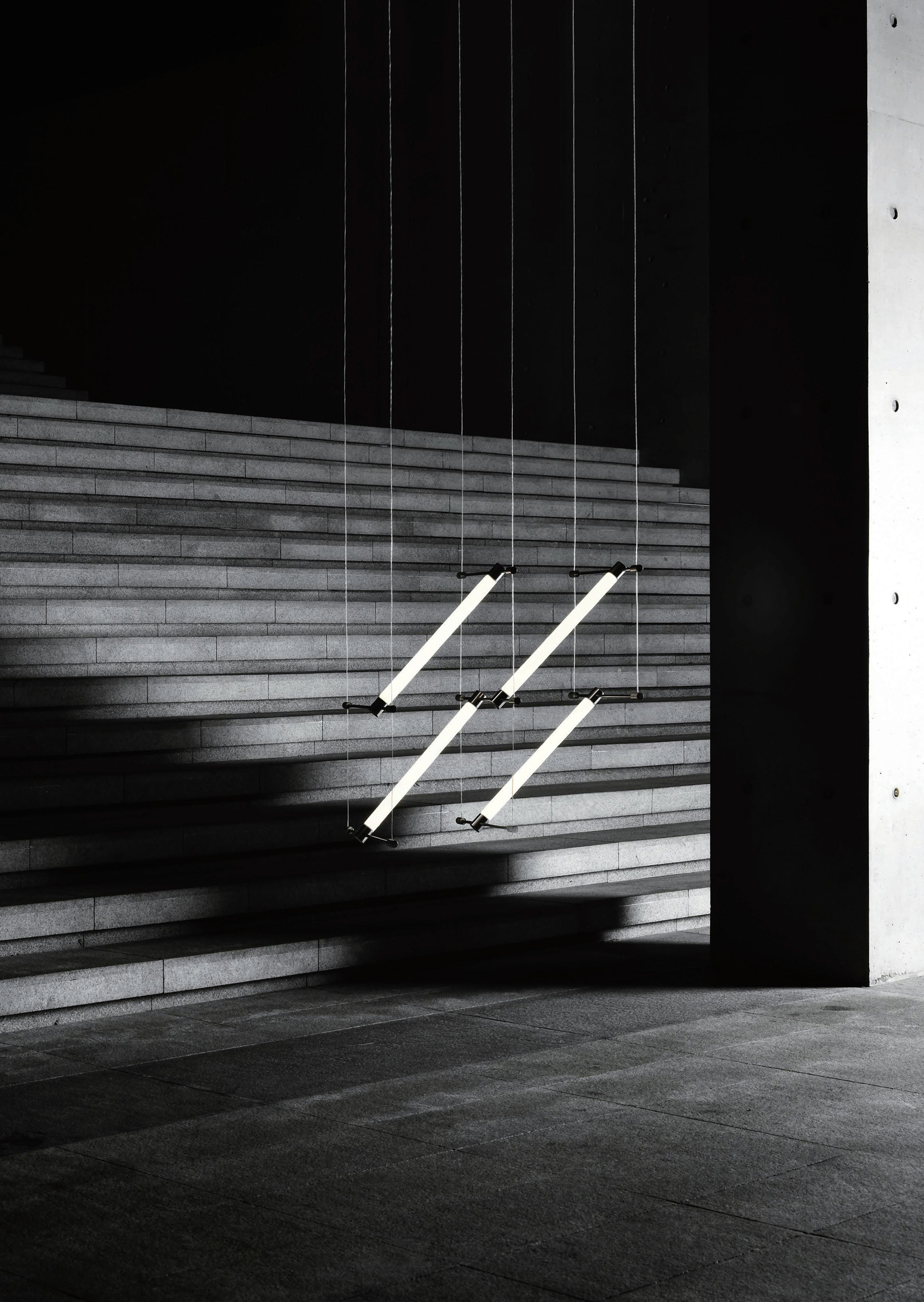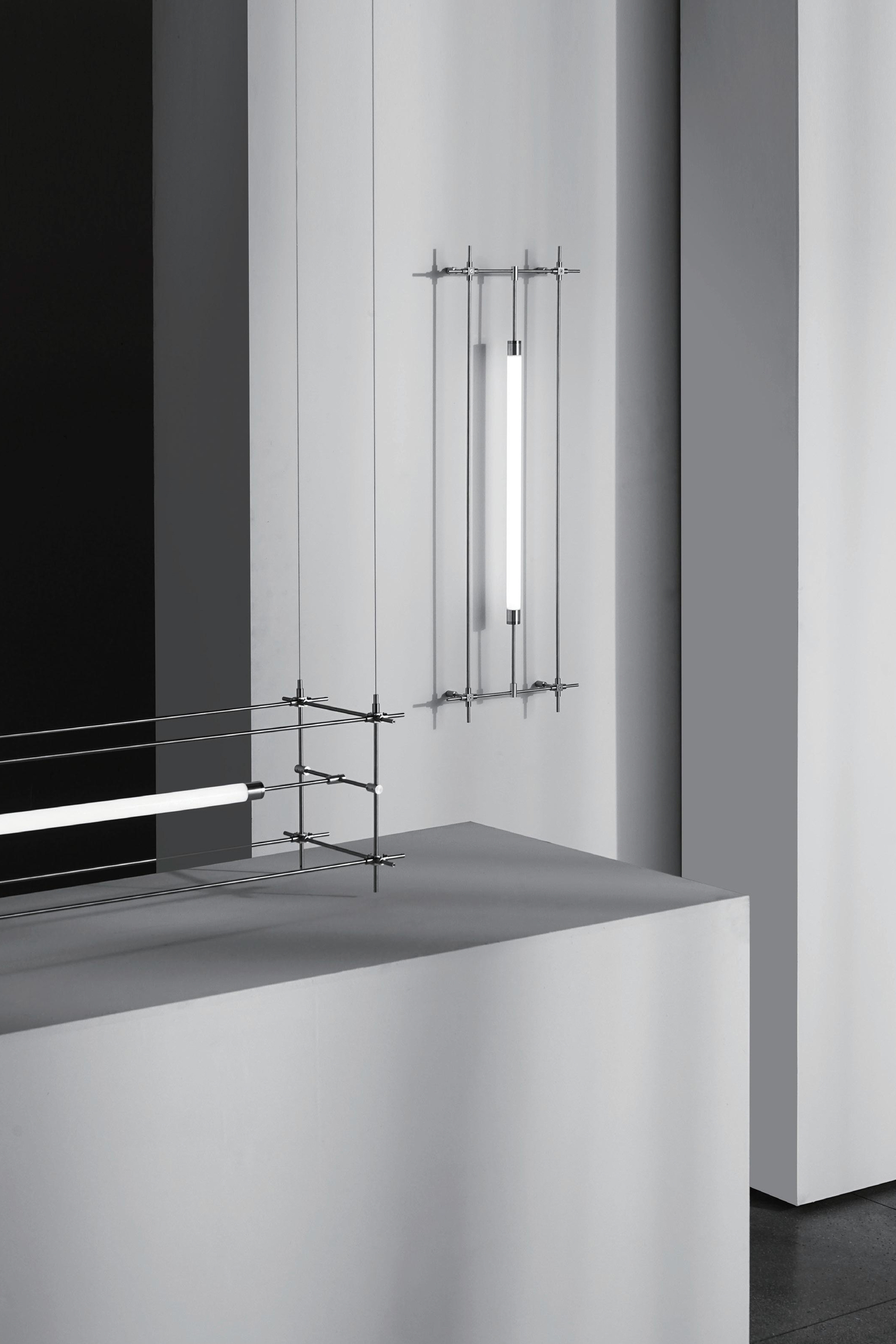 A series that exposes structural elements as part of its design. Thin beams of light cut through space, forming chandeliers, wall, and floor lamps.