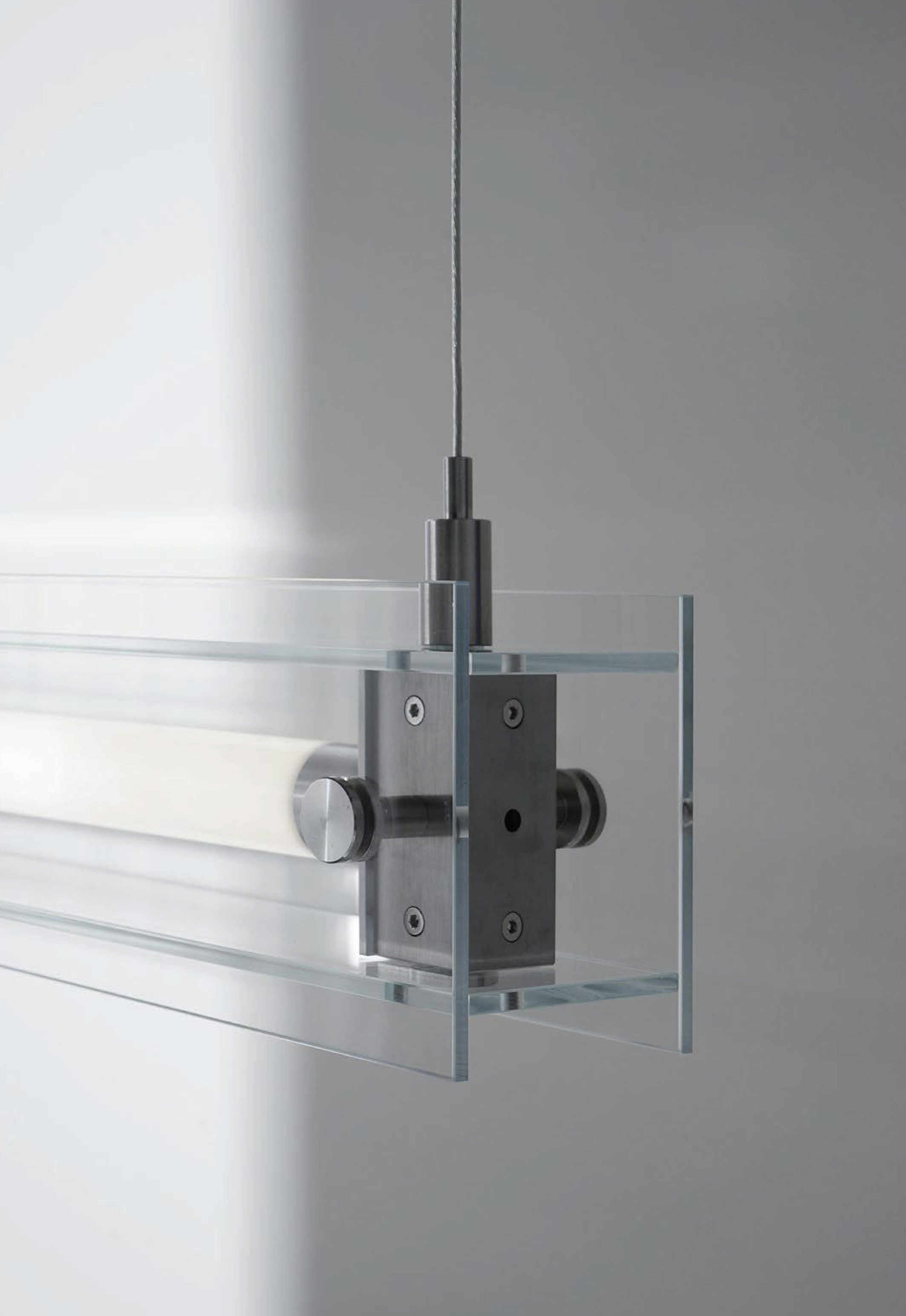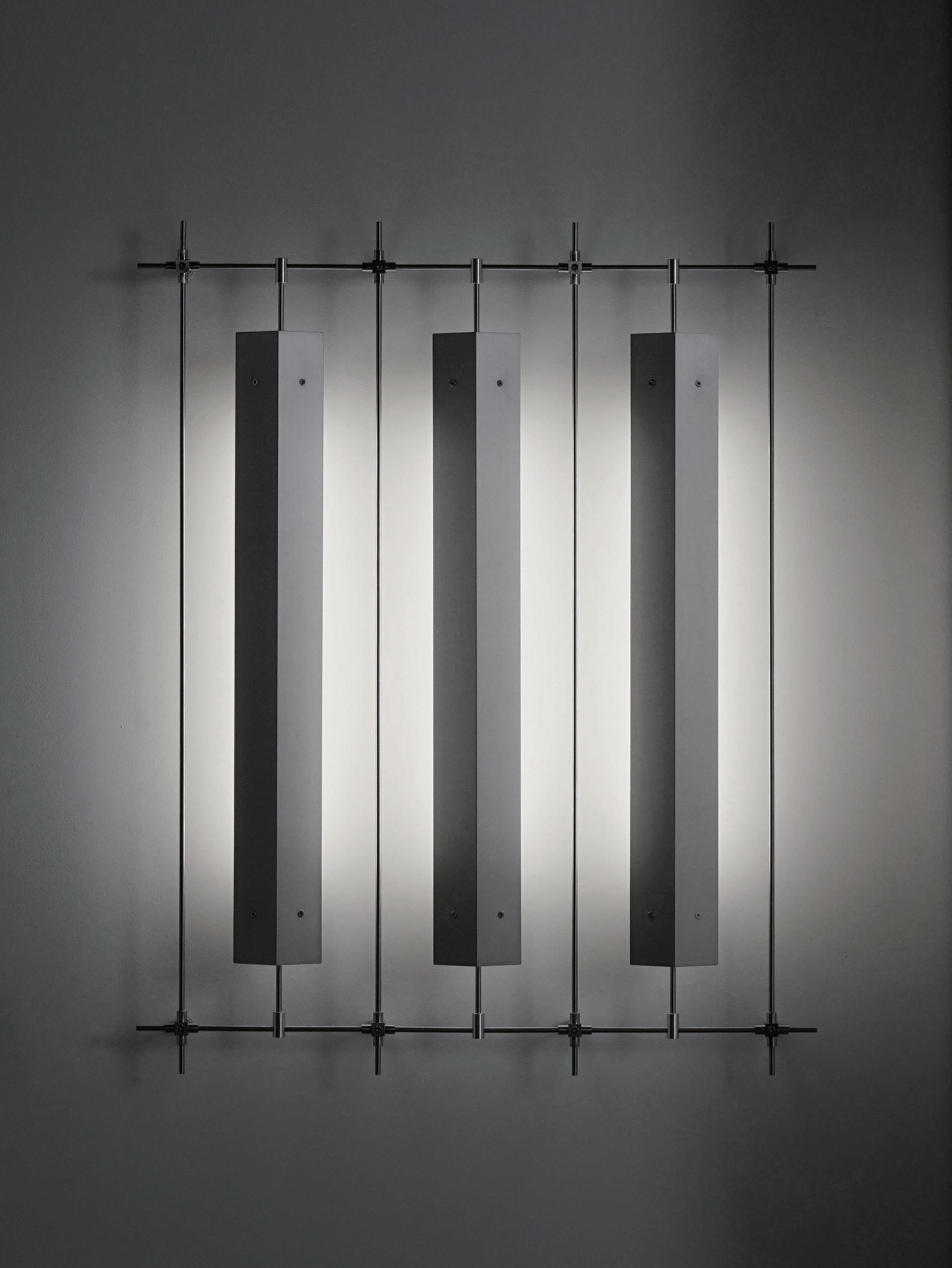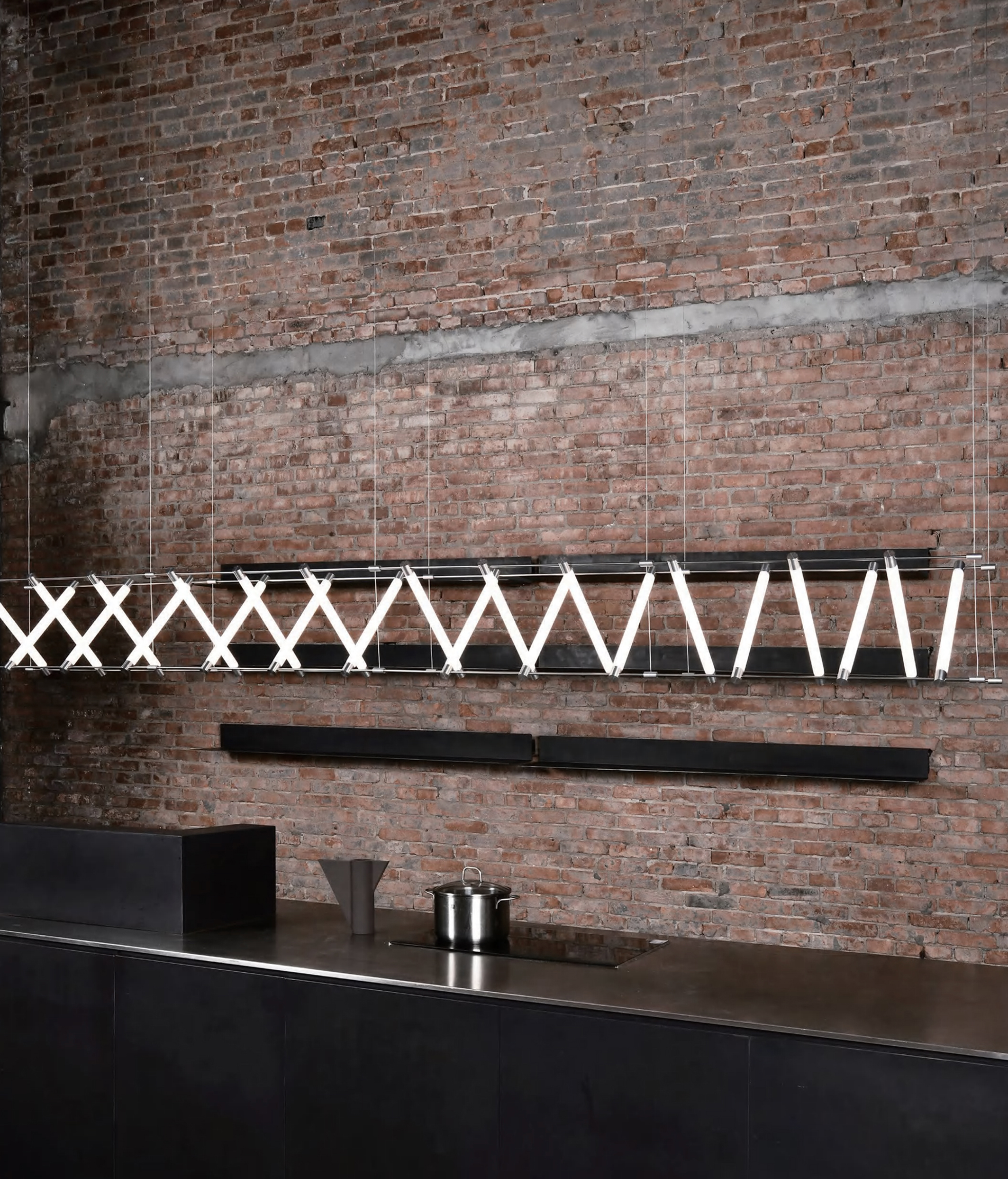 A series that exposes structural elements as part of its design. Thin beams of light cut through space, forming chandeliers, wall, and floor lamps.