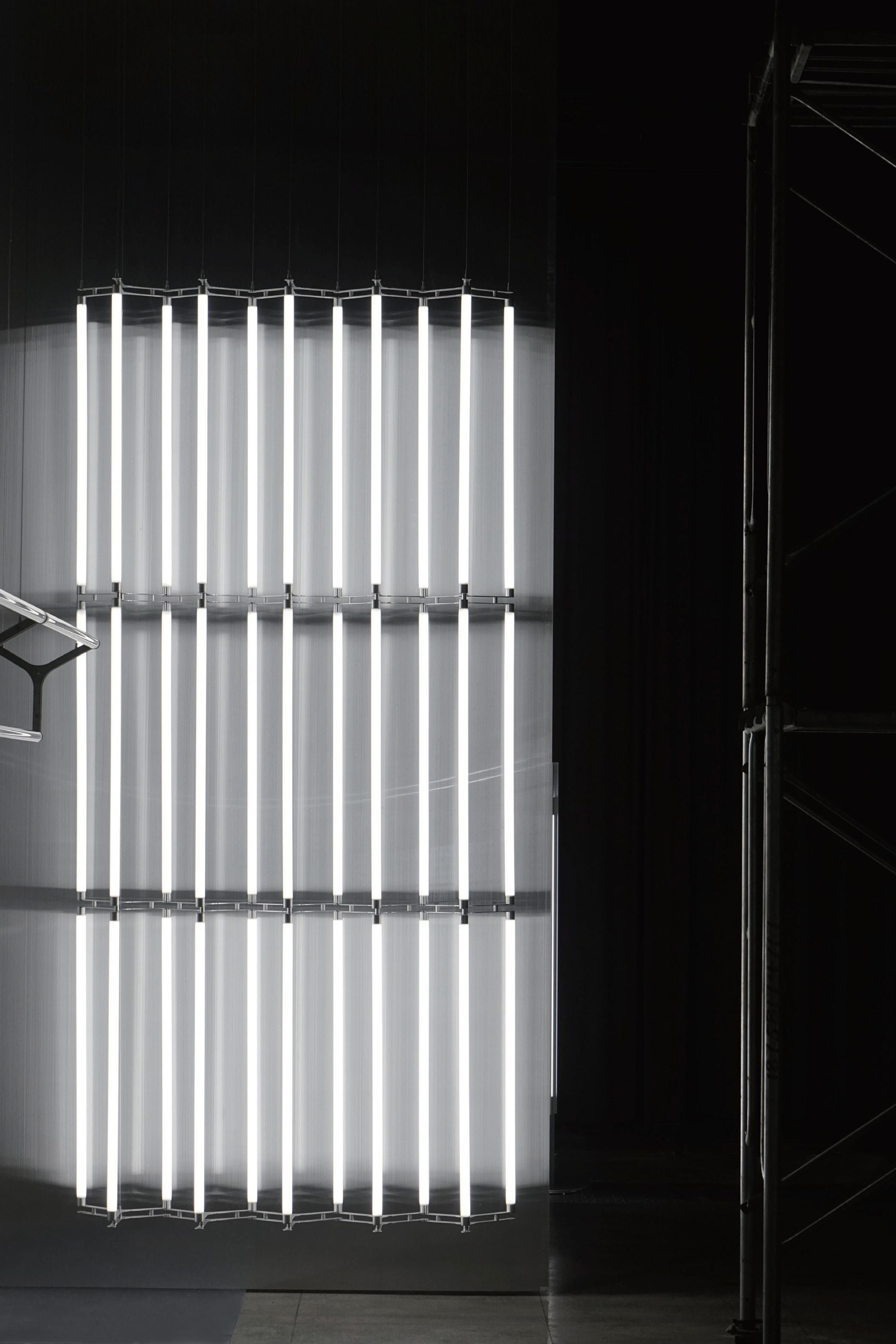 A scalable modular system inspired by construction scaffolding. Tubes form three-dimensional grids of light that grow in space.