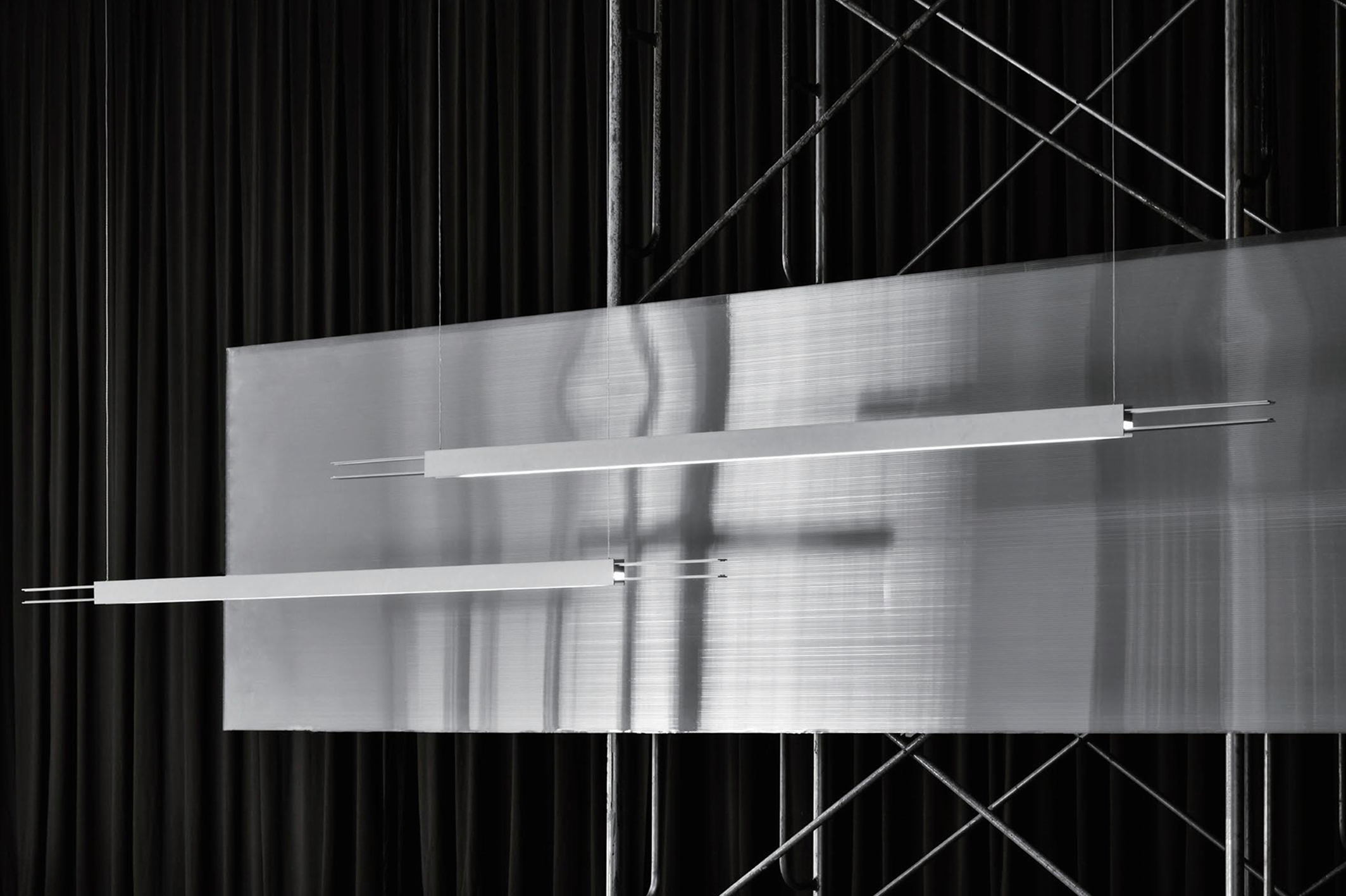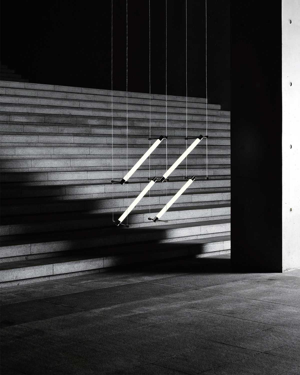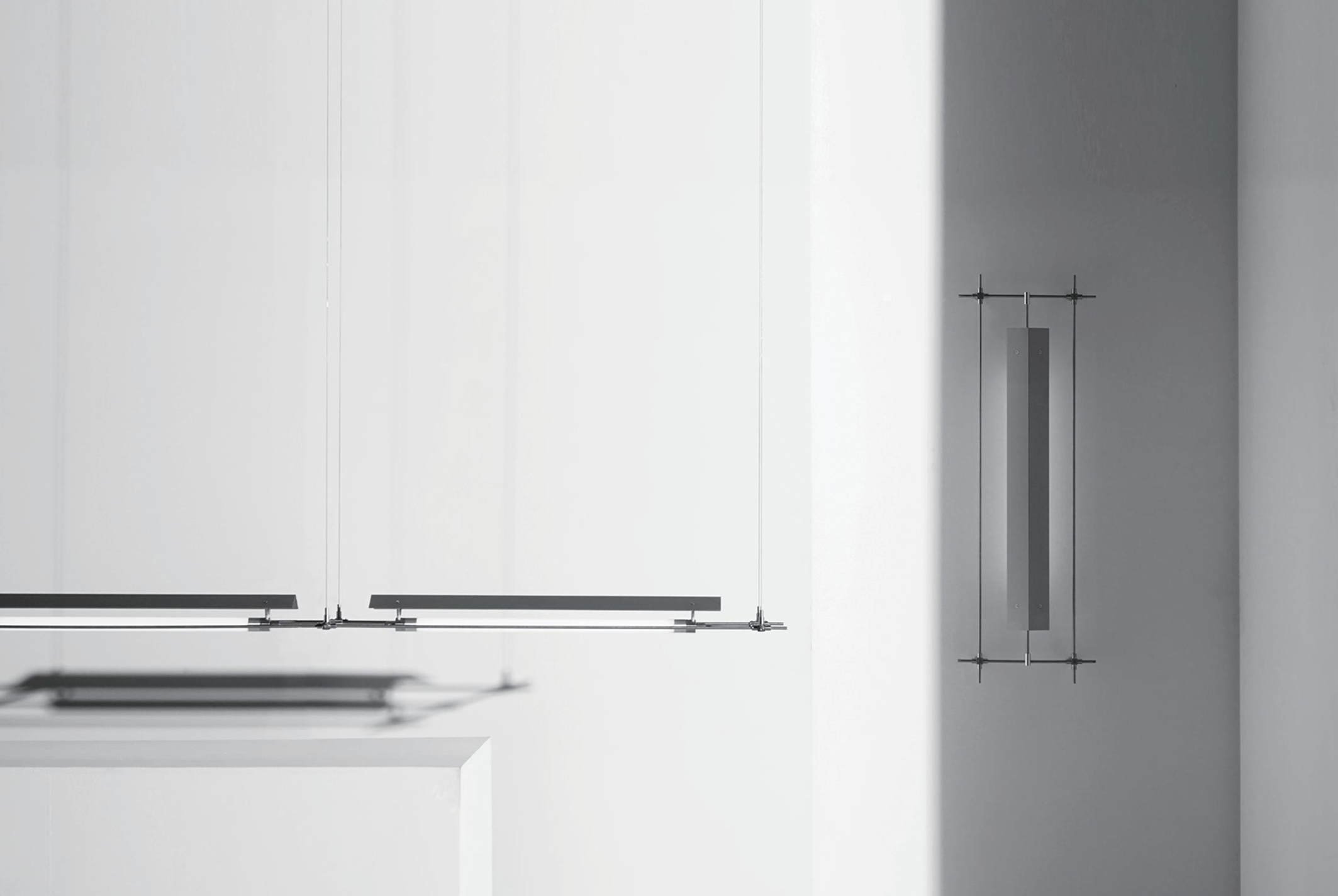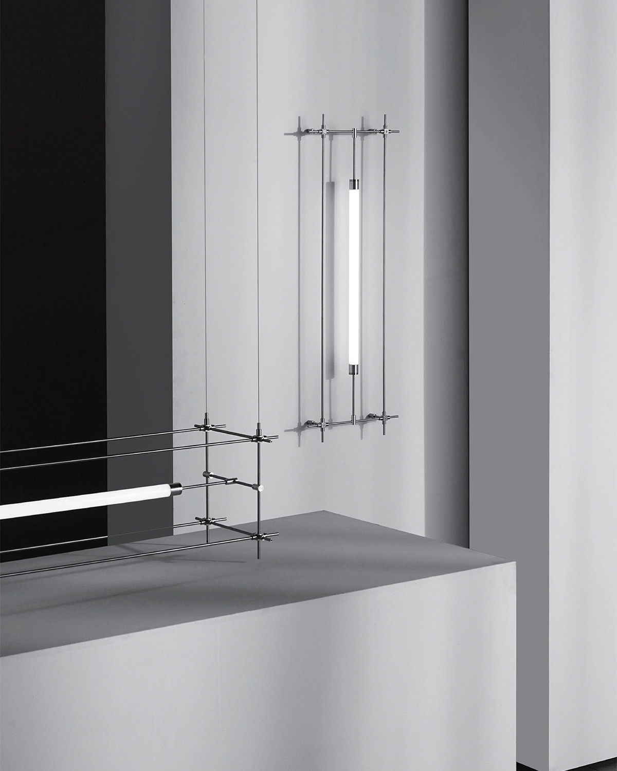 A series that exposes structural elements as part of its design. Thin beams of light cut through space, forming chandeliers, wall, and floor lamps.