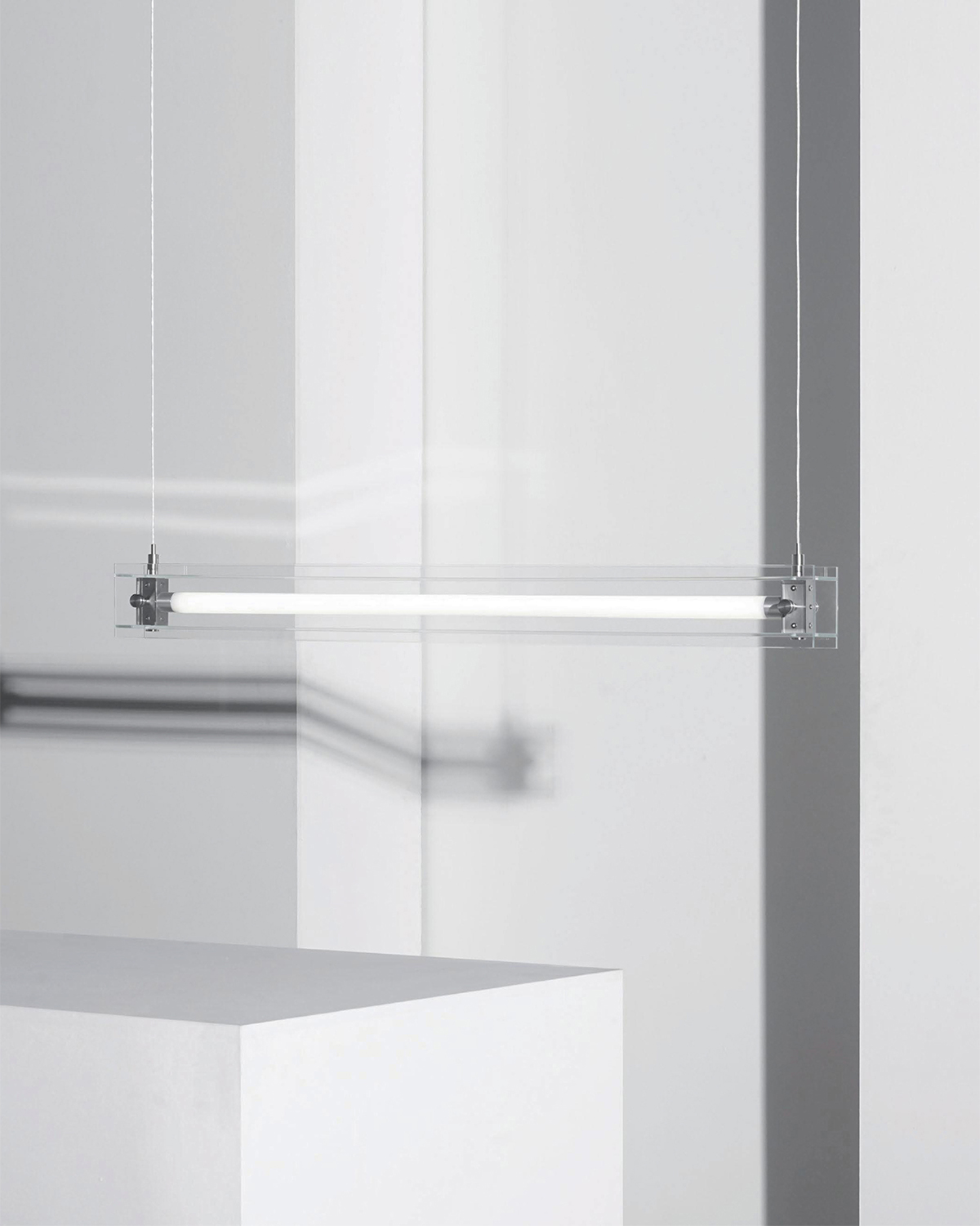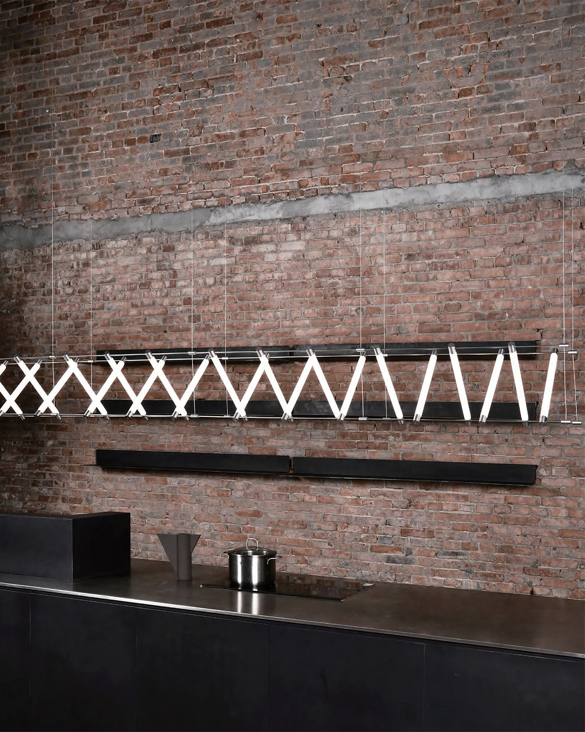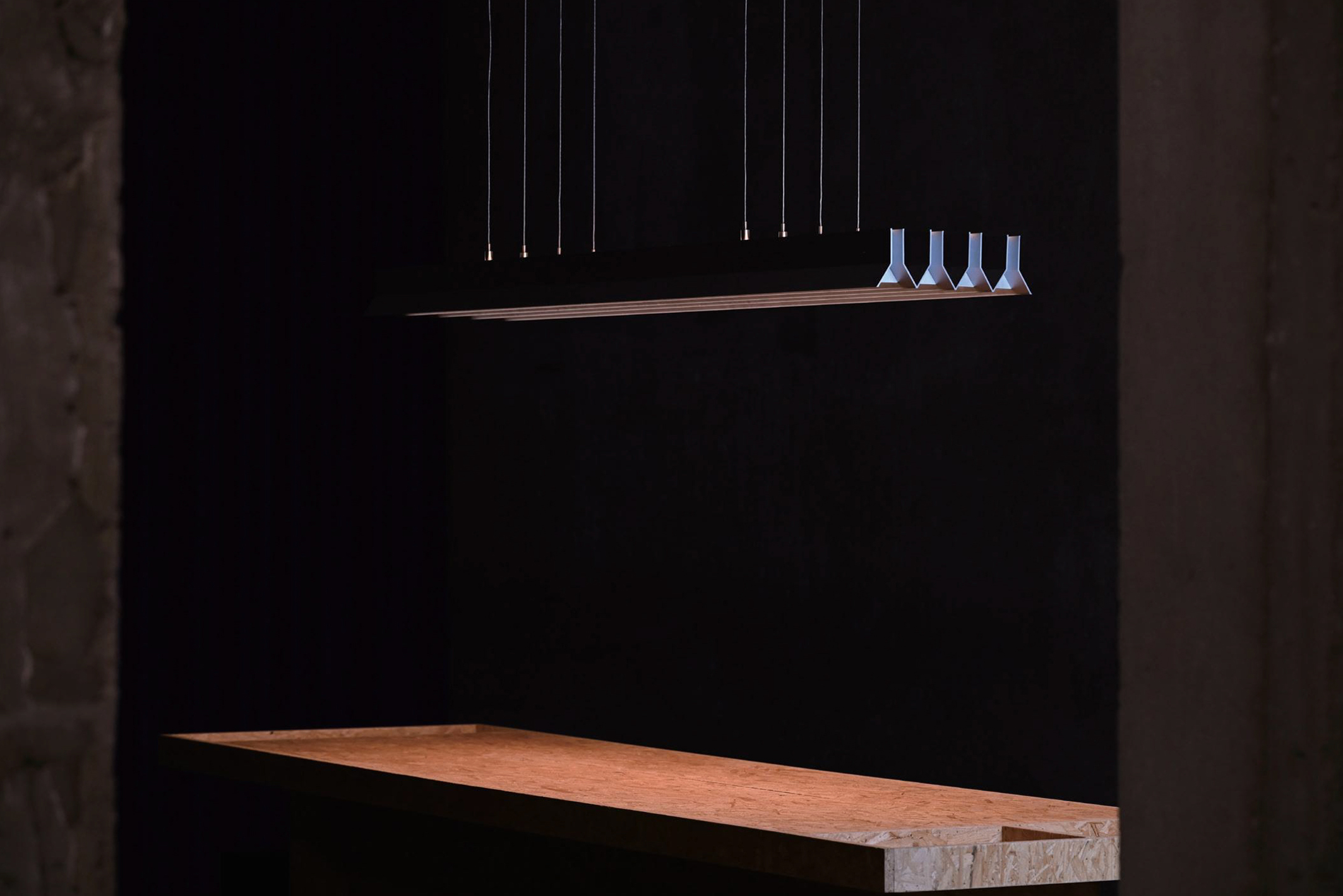 A series that exposes structural elements as part of its design. Thin beams of light cut through space, forming chandeliers, wall, and floor lamps.