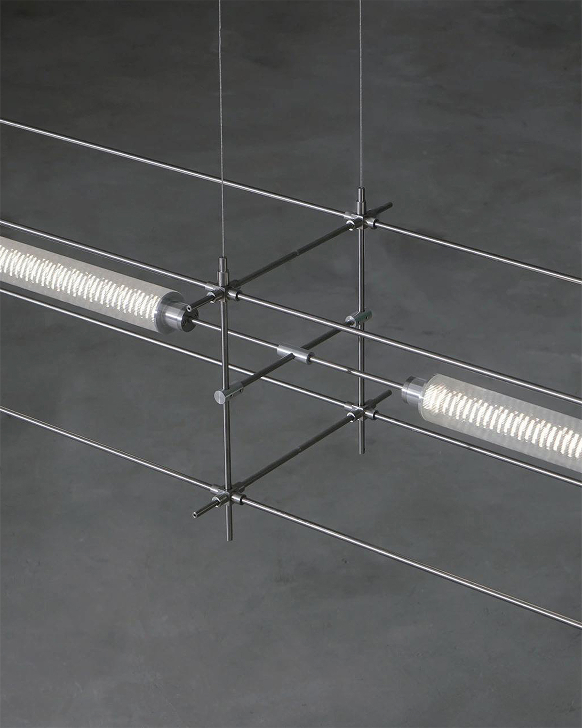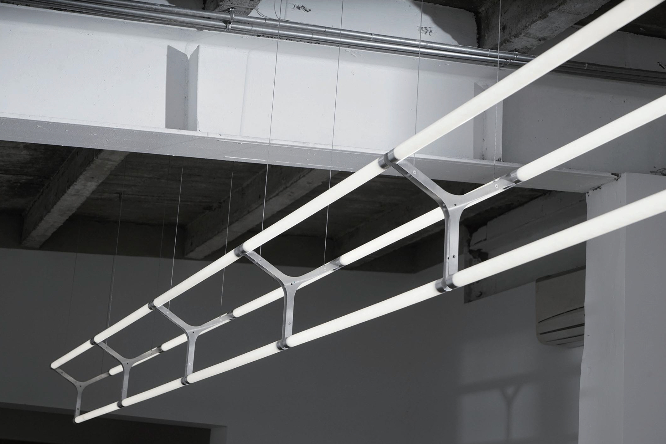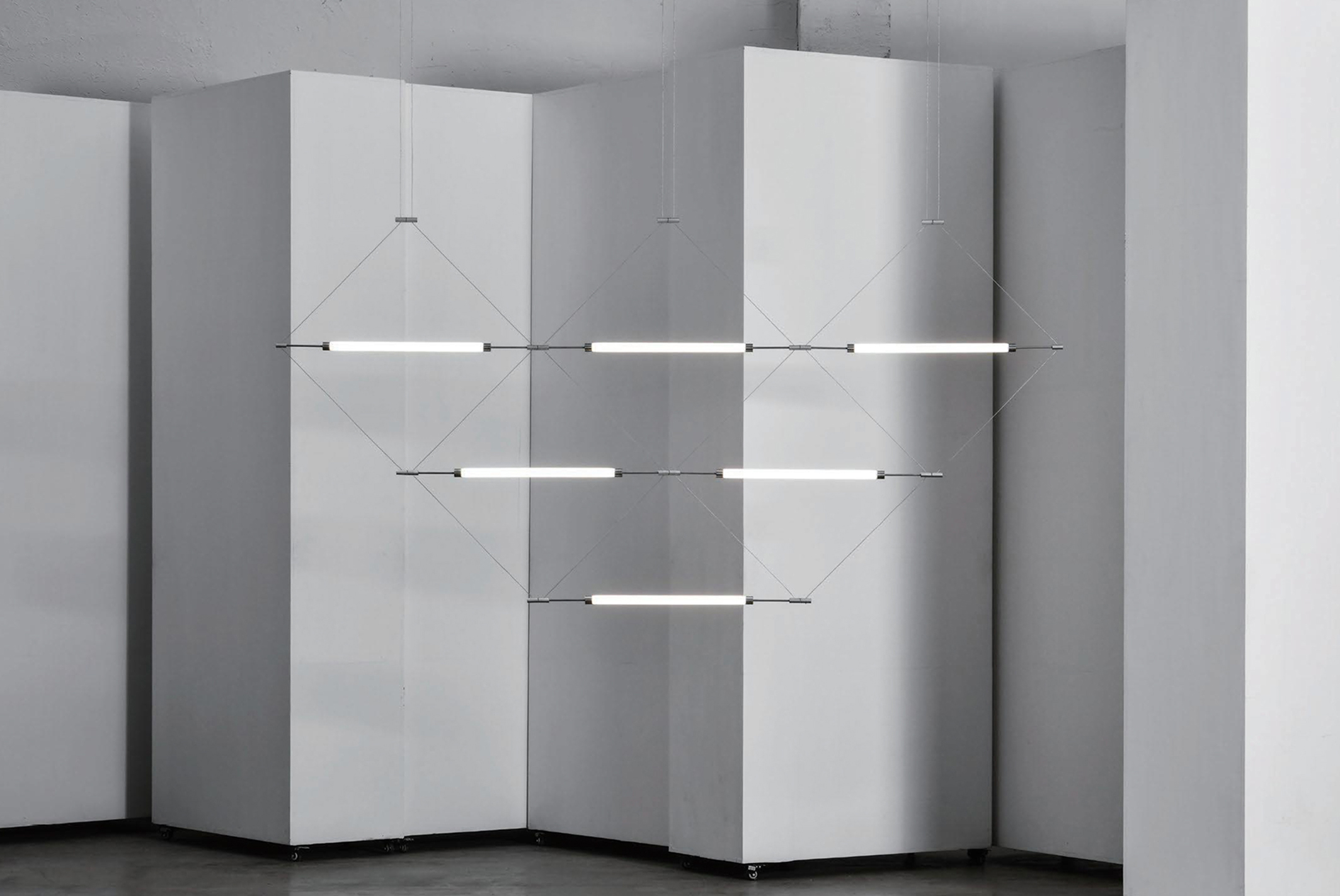 A structural light net built from wires and tubes. Works as ceiling light, wall fixture, or spatial partition.