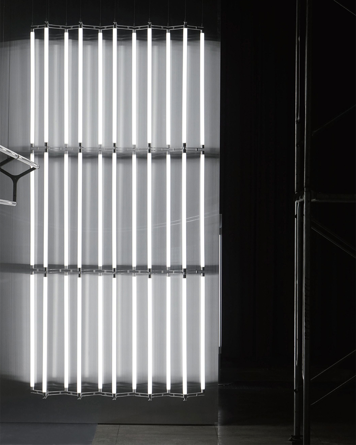 A scalable modular system inspired by construction scaffolding. Tubes form three-dimensional grids of light that grow in space.